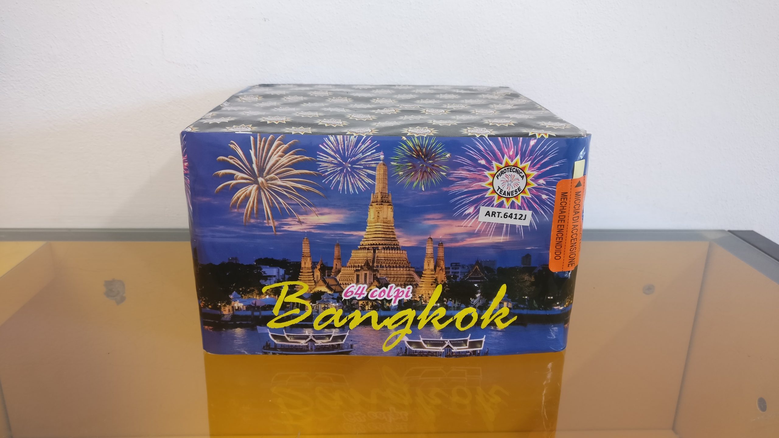 Effetto: Coda rossa con lampeggiante rosso e bianco,  coda verde con lampeggiante verde ed oro, coda viola con grande crisantemo blu,  coda rossa con lampeggiante rosso e crackling,  coda verde a limone e crackling,  coda blu con lampeggiante verde e crackling,  coda viola con grande crisantemo.